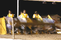 グァムでドッグレース(2000/3/4) 今年の社員旅行はグァムだ。 初日の夜はドッグレース。 ウサギの人形を追いかけて、 腹ペコの犬が走る。 1レース目にいきなり当てたが、 5レースやって結局負け。 勝って派手に遊ぼうと思ったのに...