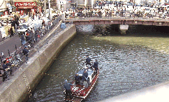 5番街で事件か?(2000/4/12) 横浜5番街の南幸橋(ナンパ橋)に、 人が群がってる。 何と川に、警察のボートが。 警備の警官に尋ねたところ、 「証拠品」の回収だという。 それ以上は教えてくれないが、 ひどく気になった。