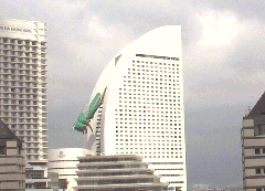 巨大バッタがホテルにとまる(2001/9/4) おとといから始まった美術展、 「横浜トリエンナーレ2001」の 最大の目玉、 巨大なバッタ風船が、出現した。 一時は資金難から、頓挫しかかったが、 どうやら完成したようだ。 あんな風の強い埋め立て地の突端で、 大丈夫なのかな。