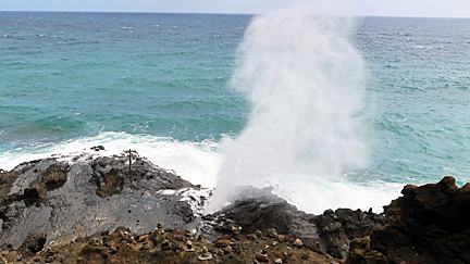ハロナ潮吹き岩(2025/12/6) オアフ島東海岸のサンディビーチ近くに、 「ハロナ潮吹き岩」がある。 上の展望台から見ると、 白波が溶岩でできた岩場の穴に流れ込んで、 間欠泉のように潮が高く吹き上がり、それは壮観。 まさに大自然のなせる業だ。