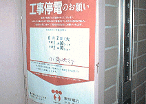 深夜の停電(1998/6/2) そろそろ寝ようかなと思ってた深夜1時。 突然、家中の電気が切れた。 雷でもないのにおかしいなと思いつつ、 懐中電灯を持って外に出る。 やがて1階エレベーター前で貼紙を発見。 何あんだ工事か。 そう言えばこの貼紙、見た覚えがある。 しかもこんなに派手に。 内容を読みもしない住人の戯言だった。