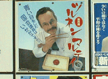 選挙運動真っ盛り(1998/7/5) 関係ないけど インディペンデンスデイもおわり、 暑い毎日が続いてる。 この熱暑の中、選挙の宣伝カーが徘徊しまくり。 ますます暑い。 次の日曜は参議院選。 おっと見つけたツルネンマルテイ。 前にも増してへんてこポスター。 何でもいいけど、 なんで日の丸弁当なわけ?