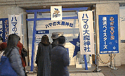 大魔神社へ初詣(1999/1/14) 年始から何やかんやで、 初詣にも行けなかった。 しょうがないので、 横浜駅の大魔神社で初詣。 聞くところによると、 今月の17日で、神社が撤去されるという。 見納めかと思いつつ帰ろうとしたら なんとお守りやら、携帯ストラップやら、 出店で「大魔神社グッズ」をしぶとく売ってる。 商魂たくましい。
