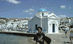 ミコノス島(1999/6/22) ホテルに着いて外に出ると、 そこは「ミコノスのテラス」 眼下に広がる入り江の景色。 海と空の青と、建物と船の白。 バイクを借りて、パラダイスビーチへ。 ヌーディストデビューしたものの、 焼きすぎて、痛いのなんのって...