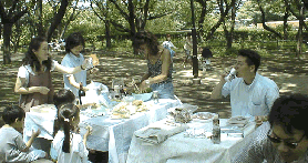 大池公園でバーベキュー(1999/7/10) 久しぶりにいい天気。 相鉄線二俣川の大池公園でバーベキューだ。 花見でしか来たことが無かったこの公園だが、 こういうのもいいモンだ。 気をつけたいのは、 おせっかいな見回りのオヤジ。 一度しゃべり出すともう止まらない。 やれやれ。