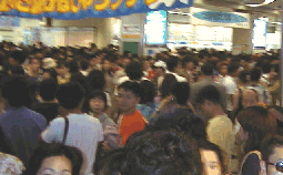 大混雑の桜木町(1999/8/1) 恐怖の大王の降臨もなく、 「7の月」は終わった。 一夜明けて今日は、 みなとみらいで花火大会。 偶然桜木町でJRに乗ろうとしたが、 大変だぁ。 帰りの切符を買う人もいて、 切符を手にするのもままならない。 えらいぞ!日本人。