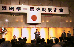 政治家のパーティー(1999/12/16) 知り合いの割り当てパーティー券で、 「浜田幸一」のパーティーに行った。 いきなり入り口でハマコーと握手。 後ろには山のように詰め掛ける、 週刊誌なんかのカメラマン達。 私のときは、 フラッシュのひとつも光らなかった。 森幹事長のときなんか、 スターマインのようだったのに。 それにしても71歳、男ハマコー。 まだ猛獣のスタミナは昔のまんまだ。